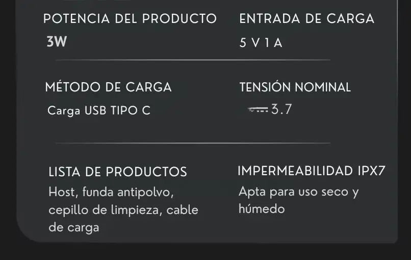 Entrada de carga: 5V = 1A, compatible con cargadores USB convencionales.
